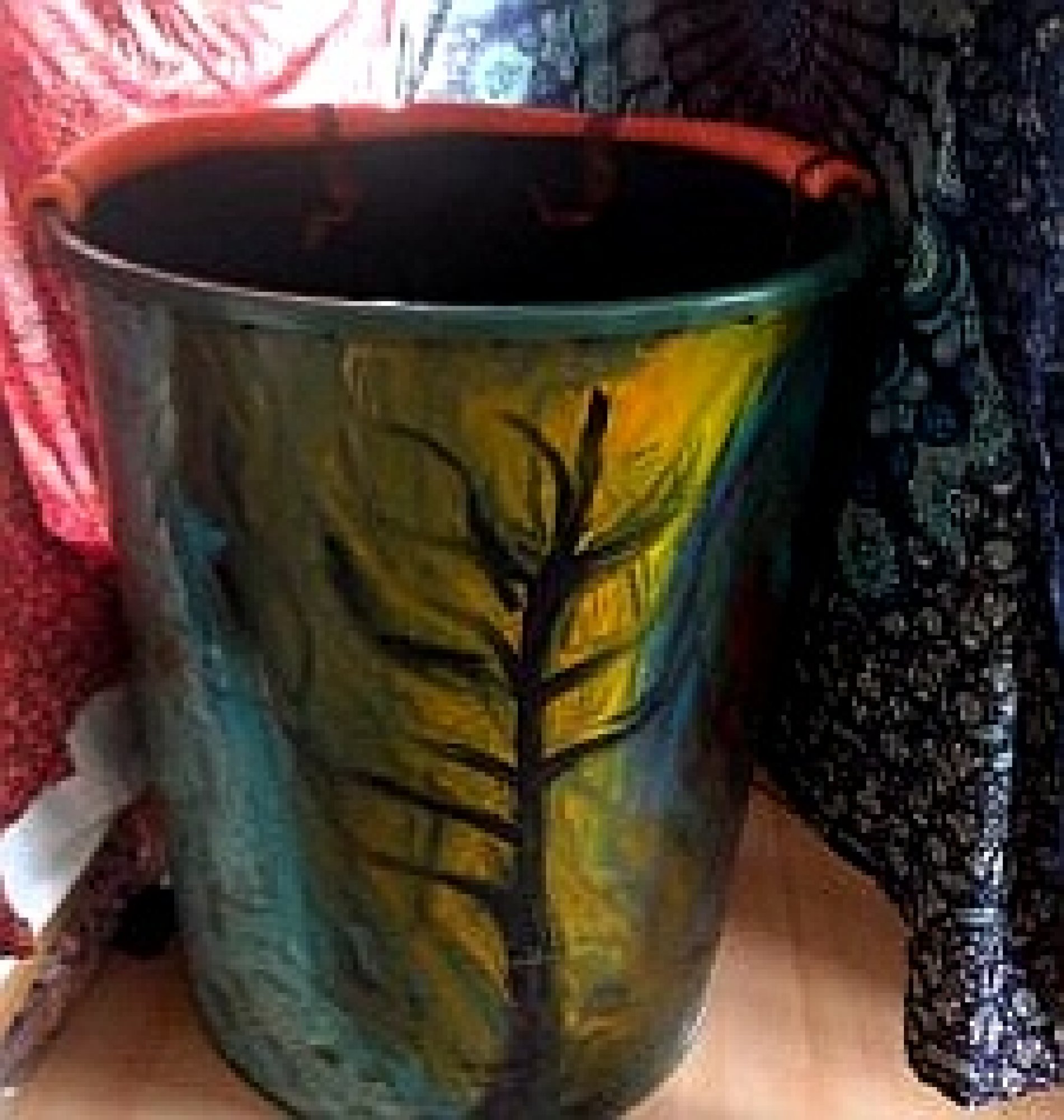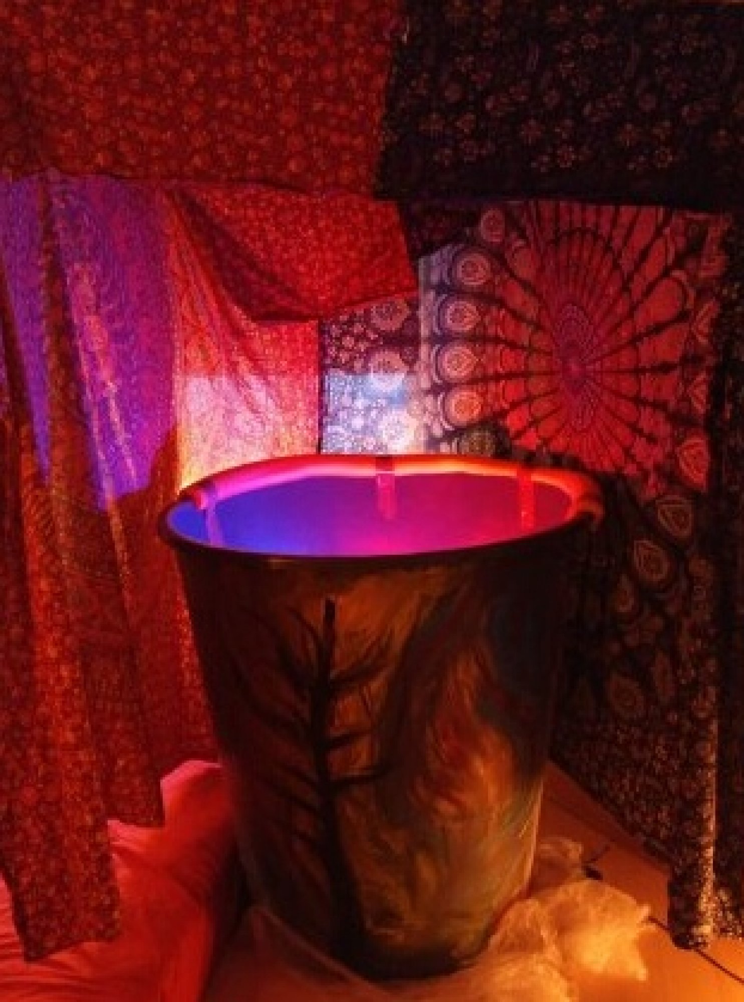 Im Laufe der Zeit entschied ich mich für eine Geburt in einer 510l-Regentonne. Mir gefiel in der Vorstellung die aufrechte Position und die intime Atmosphäre für mich und das Baby. Wir richteten das Schlafzimmer, den Geburtsort, liebevoll ein: die Tonne wurde mit Acryl bemalt, was mein Künstlerherz freute, die Affirmationen wurden als Wimpel daneben aufgehangen, ich bemalte eine Geburtskerze und bekam in einem, ebenfalls von Elisa organisiertem Geburtsvorbereitungstreffen von anderen Frauen eine Geburtskette mit besten Wünschen überreicht. Der Raum selbst sollte zur Geburt so gut wie möglich abgedunkelt (mit Decken vor den Fenstern) und nur mit der Geburtskerze und der Salzlampe beleuchtet werden. Ansonsten wollte ich möglichst Ruhe, nur die Regentropfen aus dem Lautsprecher.