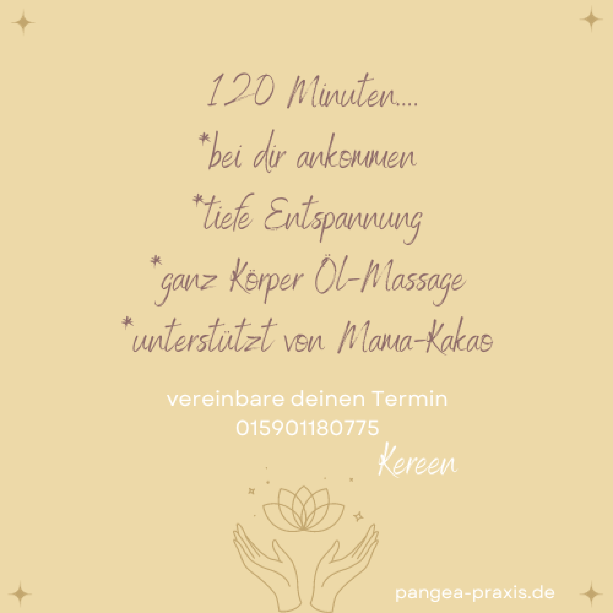 Vorab haben wir genügend Zeit deine Wünsche zu besprechen und auch, ob ich dich zu Hause besuche oder wir uns in der Pangea-Praxis treffen.
